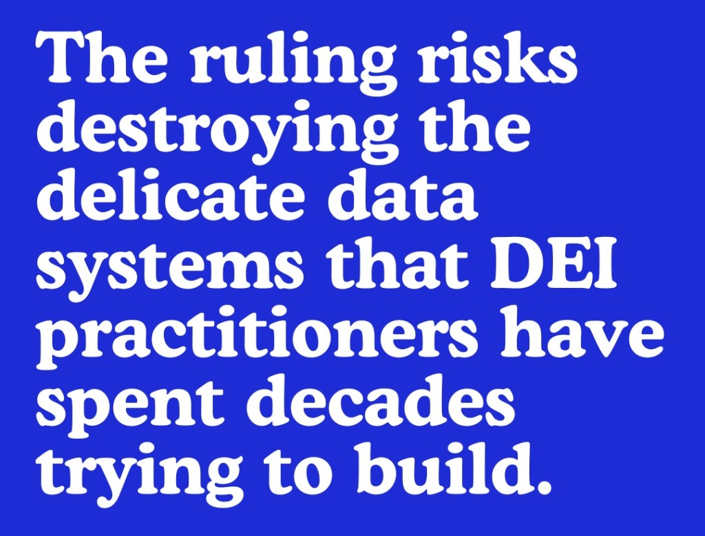 Regardless of what the ruling will actually mean in practice, the optics of the Supreme Court decision risks destroying the delicate data systems that DEI practitioners have spent decades trying to build. Efforts to engage minoritised communities, foster trust and honesty, and design systems that are accessible and inclusive are abandoned if a biology-first approach is embraced by public authorities in response to the Supreme Court ruling.