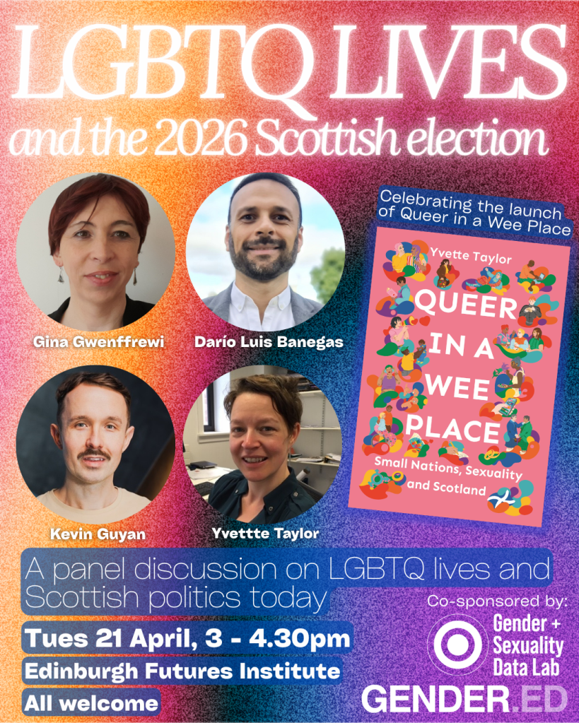This panel discussion celebrates the launch of Queer in a Wee Place: Small Nations, Sexuality & Scotland (Bloomsbury Academic)– a new collection of reflections on queer lives and experiences in Scotland. The book charts tensions between past, present and future imaginaries of a Scotland as a progressive ‘wee place’ and challenges related to the under-resourcing of and backlash against equality, diversity and inclusion initiatives, legislation such as hate crime laws and the UK Supreme Court ruling on ‘sex’ in the Equality Act.